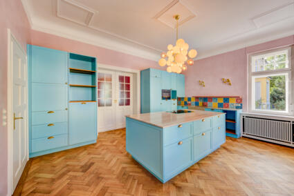 Eine natürliche, wiederhergestellte Raumabfolge, der Dachausbau, die Ausgestaltung der Innenräume und die Ausstattung mit neuem Kamin, extravaganten Leuchten und raffinierten Einbaumöbeln tragen eine ganz eigene Handschrift. Die Räumlichkeiten strahlen wieder in leuchtenden Farben und eine behagliche Wohnlichkeit macht sich nach einer technischen Instandsetzung vom Dach bis ins Untergeschoss breit.