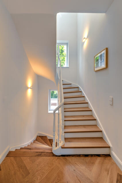 Ein alter Gartenschuppen wich einer funktionalen Garage, der feuchte Keller wurde trockengelegt. Durch Unterfangung entstand im Untergeschoss Wohnraum mit mehr Raumhöhe. Eine Treppe aus den 70er Jahren wurde entfernt und die historische, gewendelte Holztreppe wieder freigelegt und restauriert, was den Grundriss optimiert und mehr Raum schafft.