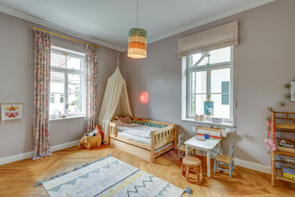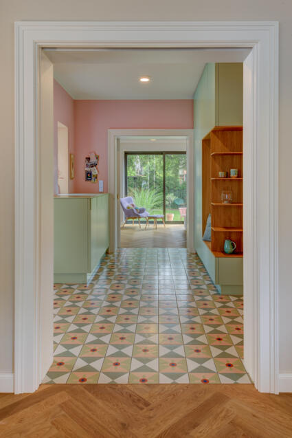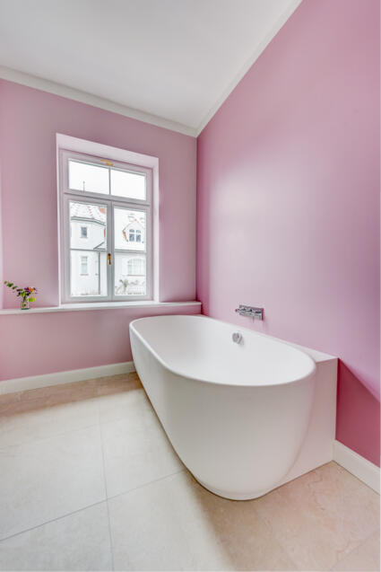 Ein ausgewogenes Farb- und Materialkonzept sowie der durchgehende Fischgrät-Holzboden aus Eichenstäben verleihen dem Haus eine warme, einladende Atmosphäre – Historie und Moderne bilden eine harmonische Symbiose.
