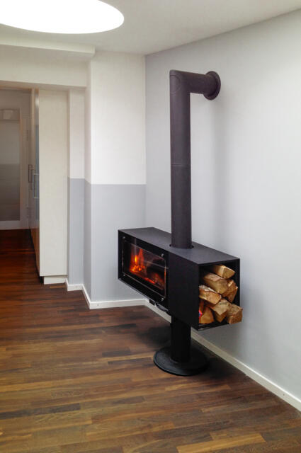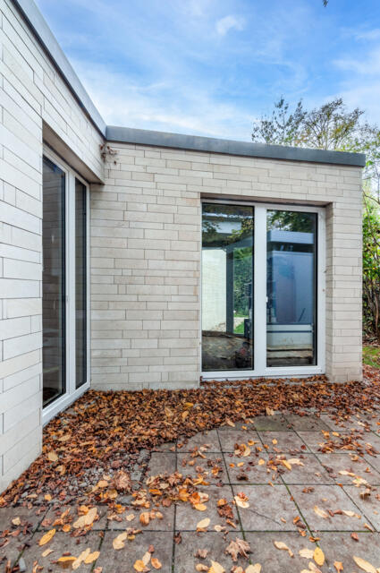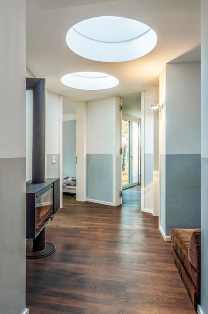 Die vier neuen Räume sind sternförmig um den Flur gruppiert und jeweils mit einem eigenen, direkten Zugang zum Garten ausgestattet. Ein gusseiserner Kaminofen im Flur schafft Behaglichkeit und setzt optisch einen ansprechenden Akzent. Bodentiefe Glasfronten sorgen für eine optimale Belichtung und verleihen Leichtigkeit und Transparenz. Alle Räume sind mit dunklen Eichenholzböden ausgestattet, die Bäder erhalten durch Böden und Wandbeläge aus Naturstein eine exklusive Note. Eine Teilunterkellerung schaffte zusätzlichen Stauraum.
