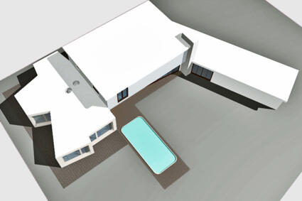 Das Architektenhaus aus den 1950er Jahren wurde für die neuen Eigentümer um 66m² Wohnfläche erweitert und bietet nach den Baumaßnahmen Platz für eine fünfköpfige Familie sowie eine Tierarzt-Praxis. Der bestehende, zweigeschossige Baukörper ist winkelförmig auf dem Grundstück angeordnet und öffnet sich zum Garten mit Pool in süd-östlicher Richtung. Am westlichen Ende des Haupthauses bildet ein Flur das Verbindungsstück zu den neuen Räumlichkeiten.