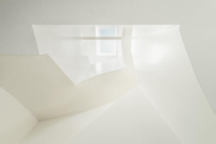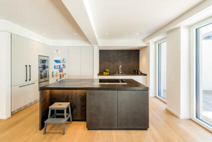 Das alte Treppenhaus wurde abgebrochen und zugunsten einer optimalen, modernen Grundrissgestaltung an anderer Stelle neu aufgebaut. Krönender Abschluss des quadratischen Treppenhauses ist ein großes Dachflächenfenster zentral über dem Treppenauge, wodurch alle Ebenen bis ins Erdgeschoss mit Tageslicht versorgt werden.