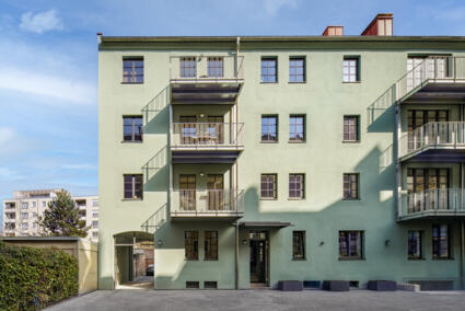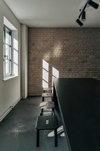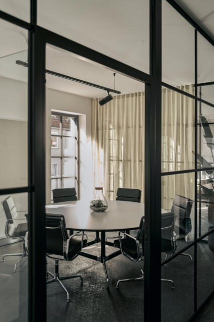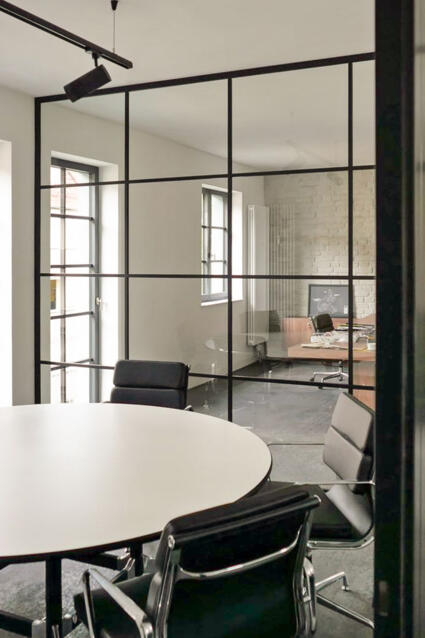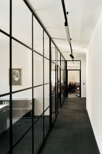 So sind moderne Gewerbe- und Büroflächen entstanden, die den Charme des historischen Industriegebäudes erhalten. Alle Fenster haben eine charakteristische Sprosseneinteilung nach historischem Vorbild bekommen und wurden teils zu großzügigen Fenstertüren erweitert, die auf neu angebaute Balkone führen. Die einzelnen Etagen wurden durch Glastrennwände in schwarzen Metallrahmen zoniert. Zusammen mit den dunklen Böden aus Gussasphalt und dem freigelegten Sichtmauerwerk sind lichtdurchflutete Loft-Flächen entstanden, die ein authentisches Flair von Industriearchitektur in die Gegenwart der alten Fabrik übertragen.
