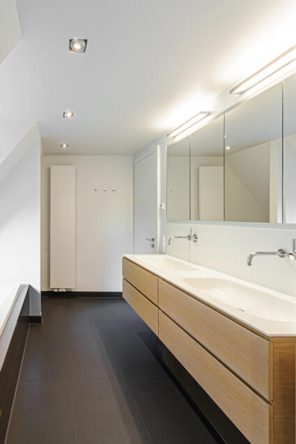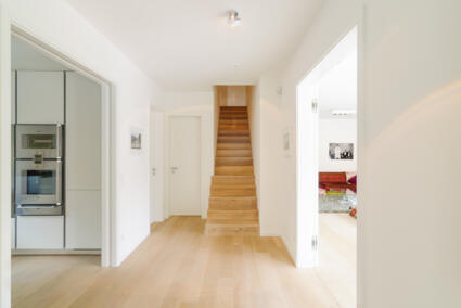 Durch die Sanierung und Umstrukturierung des Grundrisses entstanden in Verbindung mit dem offenen Wohn- und Essbereich völlig neue Perspektiven. Großformatige Hebeschiebetüren führen auf die weitläufige Terrasse mit Blick auf den Kanal und sorgen bei sommerlichen Temperaturen für ein mediterranes Wohngefühl. Das Farb- und Materialkonzept orientiert sich außen am Bestand, im Innenbereich unterstützen Eichenparkett, helle Wände und die matt-weißen Lackoberflächen der Einbaumöbel den lichtdurchfluteten Charakter.