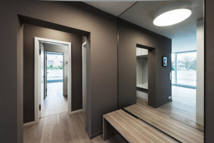 Der zentrale Aufzug wurde freigestellt und als weiß verkleideter Kubus inszeniert. Er ermöglicht den bequemen, direkten Zugang zur Wohnung. Zu den dunklen Mineralfarbtönen der umgebenden Wände bildet er einen schönen Kontrast. Gleichzeitig verschwinden in seiner Verkleidung die Schiebetüren, die bei Bedarf alle Funktionsbereiche der Wohnung voneinander abtrennen.