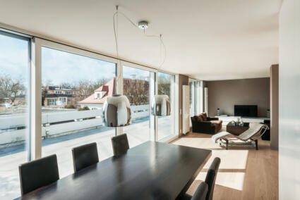 Die ehemals gefangene, dunkle Essplatz-Situation mit abgeschlossener Küche bekommt durch die Zusammenlegung der beiden Räume und einen Mauerdurchbruch zum Wohnzimmer eine entscheidende Aufwertung. Zusätzliches Tageslicht von der Südseite verwandelt die Wohnung effektvoll. Eine vierteilige Schiebetürenanlage schafft die größtmögliche Öffnung vom Wohn-Essbereich zur umlaufenden Dachterrasse. Mit einer besonderen Außenfliese belegt, bietet sich hier ein hochwertiger Außenraum.