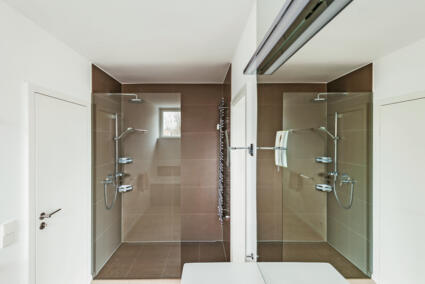 Alle Schrankeinbauten sind mit matt-weißer Oberfläche angefertigt. Die Walk-In-Dusche wirkt mit ihren großformatigen Fliesen und der rahmenlosen Glastrennwand wie ein eingestelltes Möbel. Im kompletten Wohnbereich wurden weiß geölte Eichenparkettdielen verlegt.
