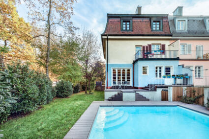 Wo vorher eine geschlossene Fassade weder Einblick noch Ausblick gab, wurde nun eine Öffnung geschaffen und bodentiefe Fenstertüren im historischen Stil eingebaut. Über den holzbeplankten Freisitz gelangt man jetzt vom Esszimmer direkt zum Pool und in den Garten. Und im Erdgeschoss hat man selbst vom anschließenden Wohnzimmer einen Blick auf das Blau des Pools.