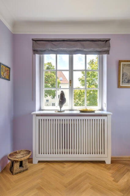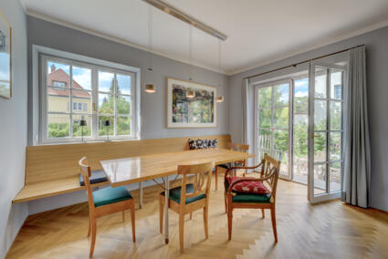 Bei der umfangreichen Kernsanierung des Erdgeschosses sowie des Dachspitzes wurden alte Bestandseinbauten behutsam aufgearbeitet und neue Fenster und Türen nach historischem Vorbild hergestellt, um die Authentizität des Hauses zu erhalten.