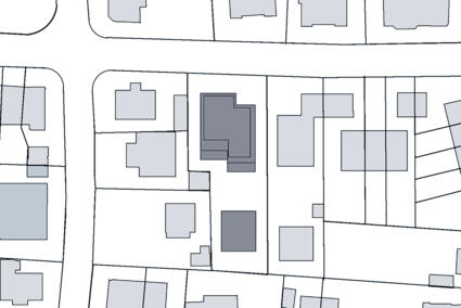 Im grünen rückwärtigen Grundstücksteil sitzt luftig, aber geschützt das Einfamilienhaus mit Satteldach. Mittelpunkt im durchlässigen Erdgeschoss-Grundriss ist ein offener Kamin. Im Obergeschoss werden die vier Schlafzimmer und zwei Bäder mit einem umlaufenden Kranz aus Dachflächenfenstern belichtet. Die durchgesteckte Galerie im Dach ergänzt die Wohnfläche um einen multifunktionalen Raum. Beide Baukörper sind an eine Tiefgarage angeschlossen, die sich unter dem Mehrfamilienhaus befindet. Eine Grundwasser-Wärmepumpe beheizt die Gebäude. Alle Innenräume sind mit Parkettboden und Fußbodenheizung ausgestattet.
