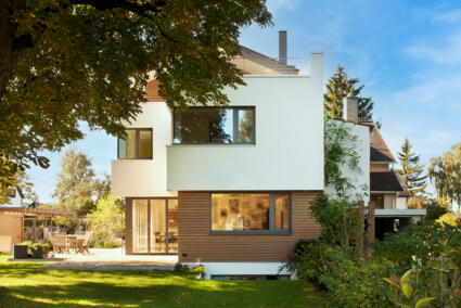 1920 wurde in München-Johanneskirchen eine Siedlung kleiner Doppelhäuser mit großem Garten zur Selbstversorgung errichtet. Um den heutigen Anforderungen eines 5-Personen-Haushaltes Rechnung zu tragen, wurde eine Hälfte des Doppelhauses zu Gunsten eines Neubaus abgetragen. Herz des neu entstandenen Einfamilienhauses ist ein erweiterter Essbereich mit integrierter Küche. Schwellenlose, raumhohe Öffnungselemente lassen im Erdgeschoss Innen- und Außenraum nahtlos ineinander übergehen.